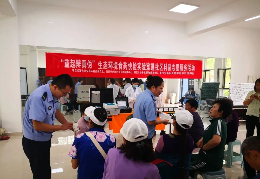 食品药品安全直接关系人民群众身体健康和生命安全。为切实帮助广大人民群众提高辨真假、识优劣能力,确保日常饮食用药安全,今年以来,鄂尔多斯市公安局环食药侦支队充分利用自备实验室优势,发挥食药快检实验在风险防控方面的技术支撑,深入开展食药快检实验进社区免费检测系列活动。活动中,工作人员耐心细致地给现场群众科普了食药安全方面的知识。实验员严格按照实验操作程序和相关要求,对具备现场检测条件的样品认真开展快速检测,当面反馈检测结果,不能现场检测的严格抽样、登记、封存。截至目前,鄂尔多斯市公安局环食药侦支队深入街道社区开展免费检测活动三批次,抽样检测各类保健品、药品86样次。